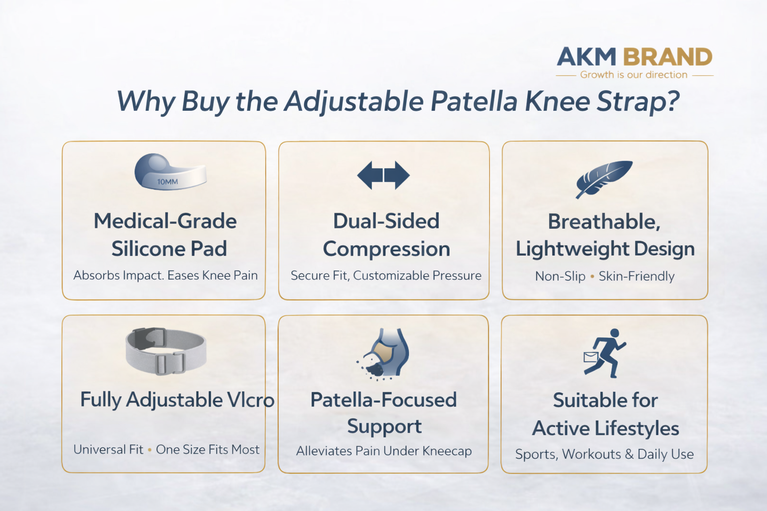 The AKM BRAND Adjustable Patella Knee Strap is designed to provide targeted support below the kneecap, helping reduce stress on the patella during movement. Featuring a 10MM medical-grade silicone pad and a fully adjustable fit, it delivers comfort, stability, and confidence—whether you’re training, playing sports, or staying active throughout the day.